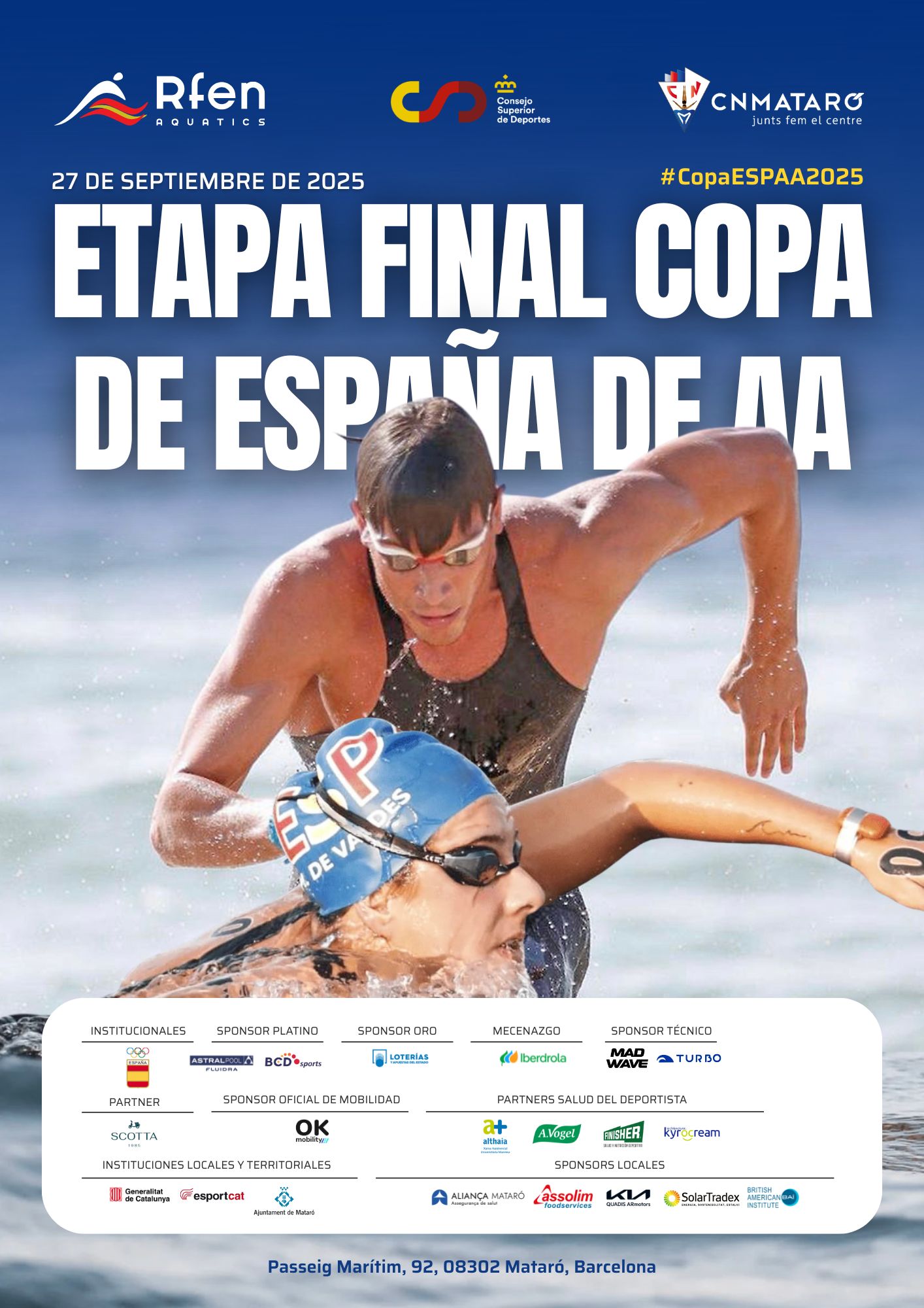 La competició es disputarà sobre un recorregut de 5.000 metres i tindrà com a punt culminant una espectacular arribada sota l’arc de meta aquàtic, just davant de les nostres instal·lacions. El tret de sortida serà a les 10h per al masculí i a les 10:10h per al femení. Amb aquesta jornada històrica, Mataró i el CN.Mataró reafirmen la seva condició de referents en l’organització de competicions d’elit i en la promoció de les aigües obertes, consolidant el nostre lligam amb l’esport i el mar.