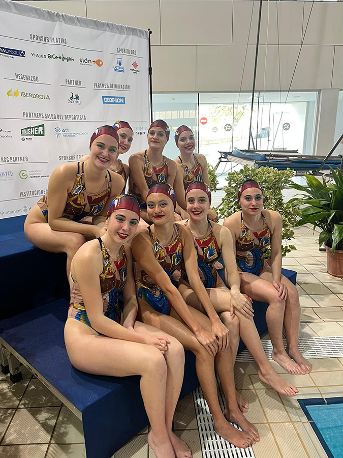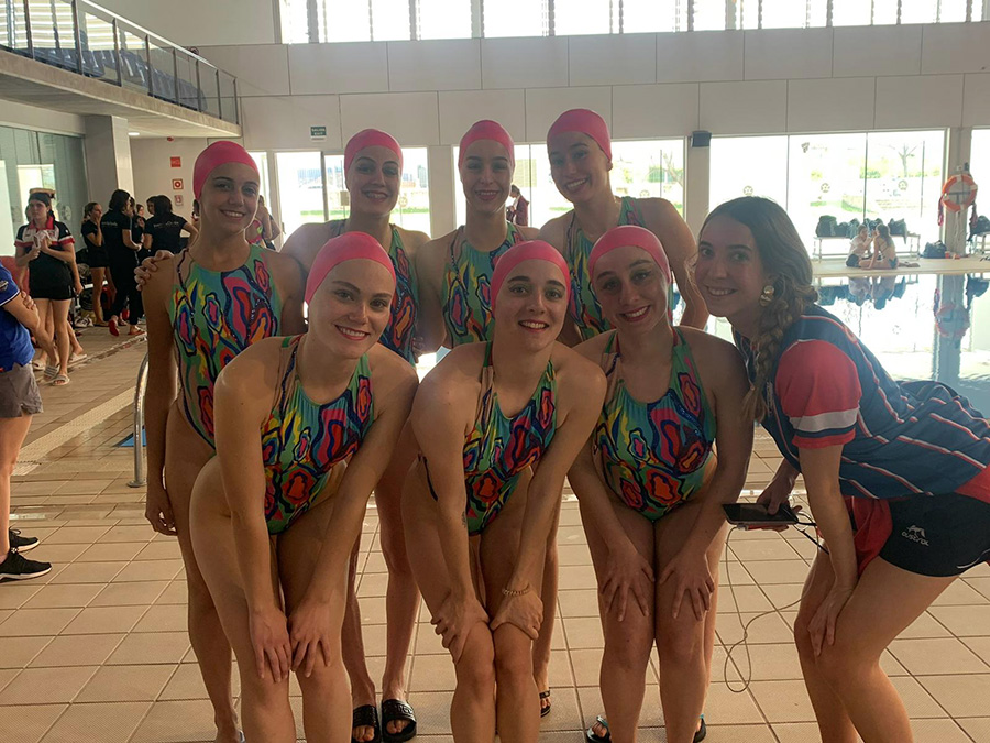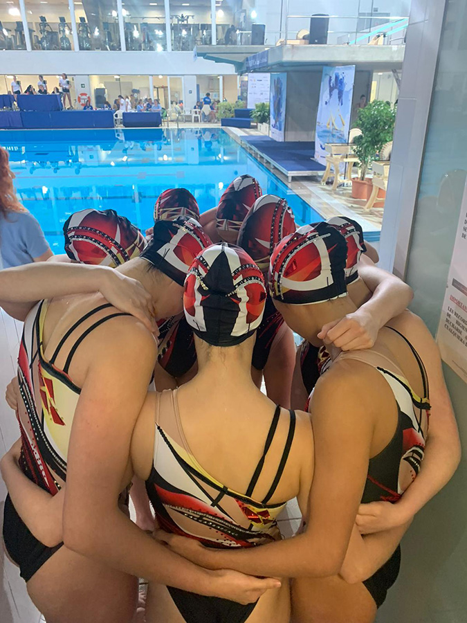 En les coreografies per Equips, les nostres nedadores van ser la Magalí Alarcón Ripoll, l’Helena Gallardo Reixach, l’Aina Pidal Andreu, la Laia Medina Muñoz, la Sara Hernàndez Alarcón, la Laura Ansó Rudi, la Carlota López Reixach, la Isabel Shuang Cui Xu i la Gal·la Altarriba Aranda. Després de fer un gran treball a l’aigua, es van classificar en la 8a. posició i en la 7a. en la Rutina Acrobàtica, essent molt ben valorades pels jutges àrbitres.