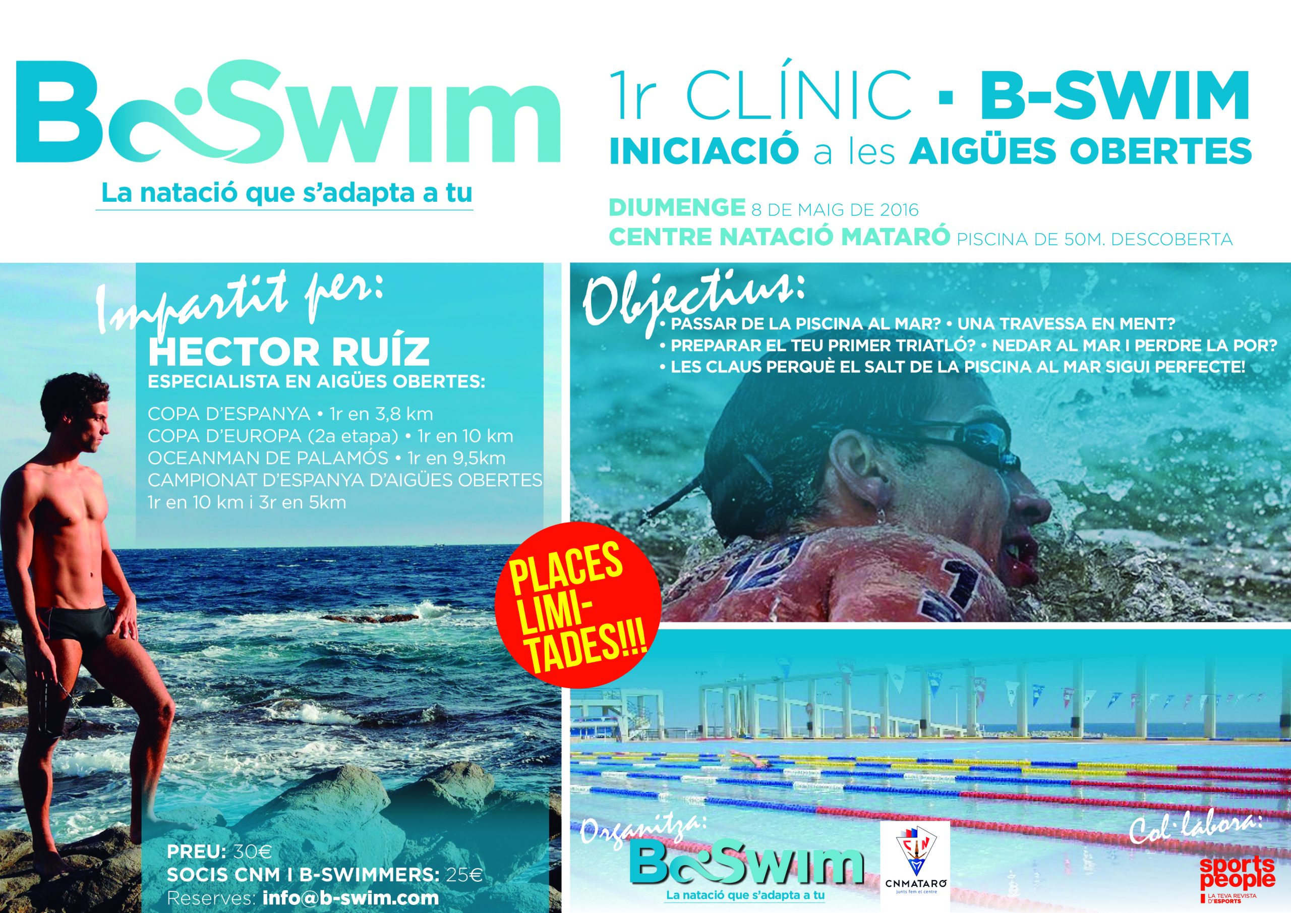 Per a tots els que heu pensat en començar a nedar a mar d’una manera competitiva. Per als que voleu apuntar-vos a la primera travessia, per als que voleu aprendre tècnica, estil i estratègies a mar obert, el diumenge dia 8 de maig, al Centre, B-Swim organitza un Clínic que us endinsarà en l’apassionant món de la natació en aigües obertes. L’Héctor Ruiz, campió de diverses modalitats en diversos campionats, tant nacionals, estatals com europeus serà l’encarregat d’explicar tot el que podem descobrir en la natació d’aigües obertes.