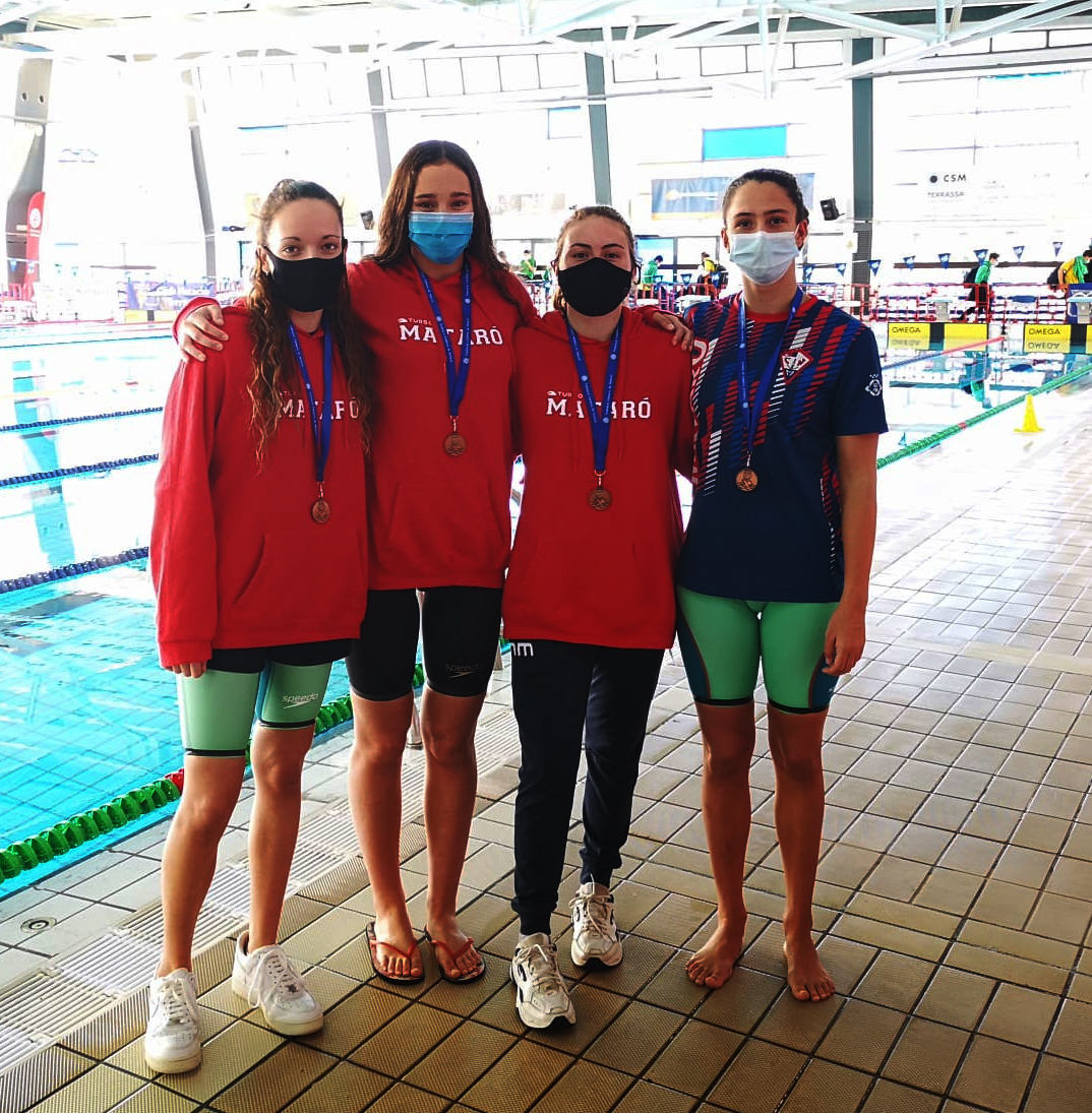 El nostre equip Junior de Natació ha aconseguit ser subcampió de l’Open Internacional de Catalunya que s’ha nedat al CN.Terrassa amb els guardons obtinguts pels nostre nedadors juniors que han aconseguit un campionat, en Pol Martínez i en els 50 braça i fins a quatre medalles en els relleus que sumada a la medalla de plata absoluta d’en Jan Giralt deixen la sensació d’una bona competició feta, tristament marcada per la dificultat que suposen les interrupcions en els entrenaments i haver-se d’adaptar als escenaris canviants. Han estat els juniors els qui han pujat al podi per a recollir-hi diverses medalles. Dues individuals d’en Pol Martínez, una d’or, proclamant-se campió en la prova dels 50 braça i l’altra la medalla de bronze en els 100 braça. En relleus els nostres juniors van demostrar que estan molt fins. A la primera jornada en els relleus 4×100 lliures, les noies i els nois van ser subcampions, guanyant una medalla de plata molt important. Els relleus els van formar; la Laia Fanlo, la Judith Garreta, la Ruth Atencia, i la Jana Vilariño. I en nois; en Manel Casado, l’Òscar Sànchez, l’Abel Reyes, i en Pau Fanlo. No es van acabar aquí els èxits en relleus, l’endemà en el 4×200 lliures, els nostres van tornar a demostrar molt bona forma i els nois es van penjar la medalla de plata, un relleu format per l’Abel Reyes, en Pol Martínez, en Manel Casado, i en Pau Fanlo. Les noies van guanyar la medalla de bronze i les seves component van ser; la Jana Vilariño, la Laia Fanlo, la Judit Garreta i la Ruth Atencia. Molt ben nedat equips. En la categoria absoluta el nostre valor en Jan Giralt va pujar al podi en la prova de 200 esquena per a penjar-se la medalla de plata. La Malen Tomàs, també va pujar al podi per a guanyar la medalla de bronze en la prova de 50 metres papallona. Amb aquests resultats tan bons dels nostres juniors l’equip ha aconseguit el Subcampionat de la competició en la que suposa una nova fita per un equip que no para de créixer.