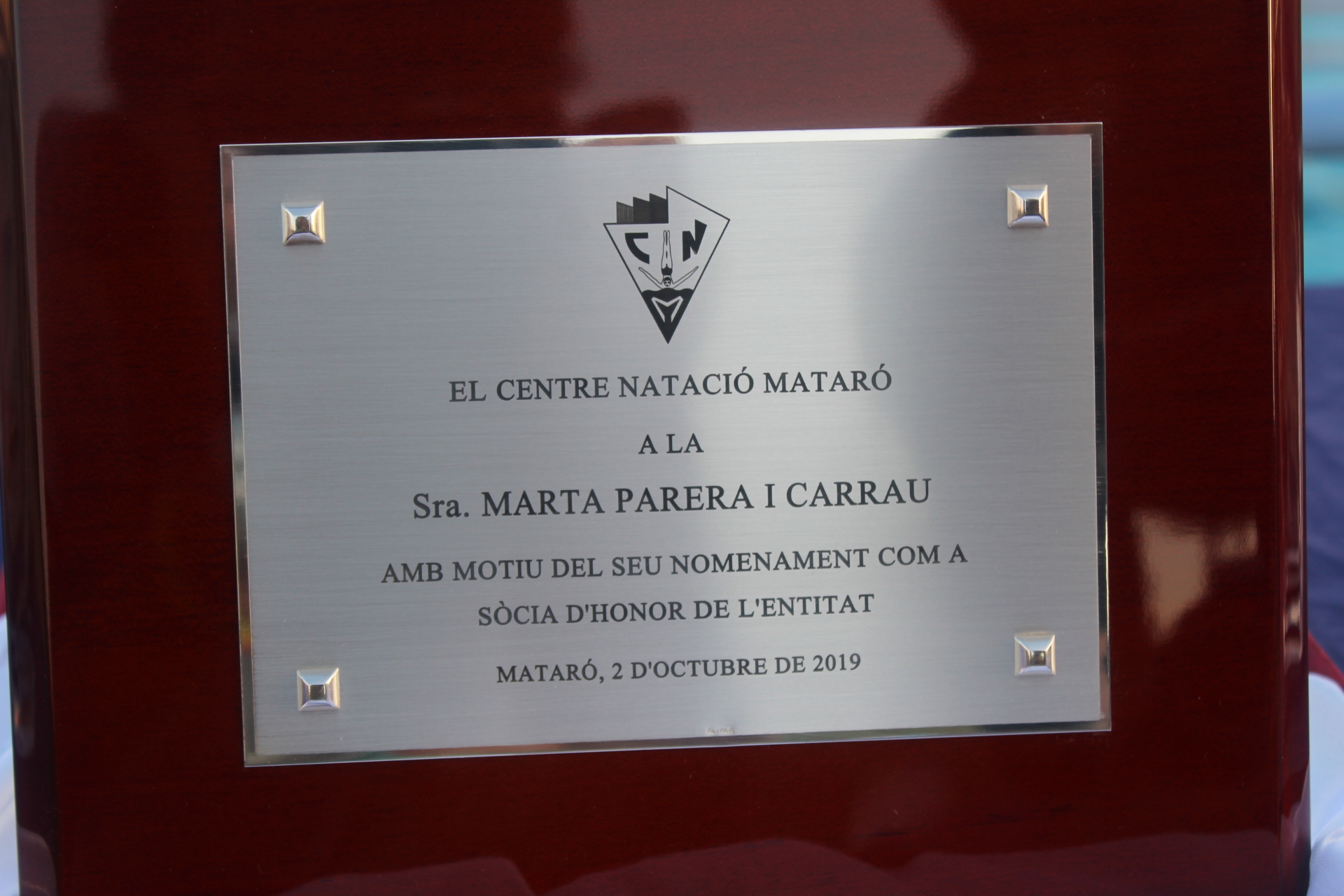 Finalment la Marta Parera, va ser nomenada Sòcia d’Honor i va rebre la placa commemorativa de mans del nostre president. En les seves paraules, molt sentides, va mostrar el seu agraïment per tots els anys dedicats al Centre com a nedadora, com a sòcia i com a directiva i va tenir un emocionat record per l’anterior president el sr. Josep Masriera que era present a l’acte.