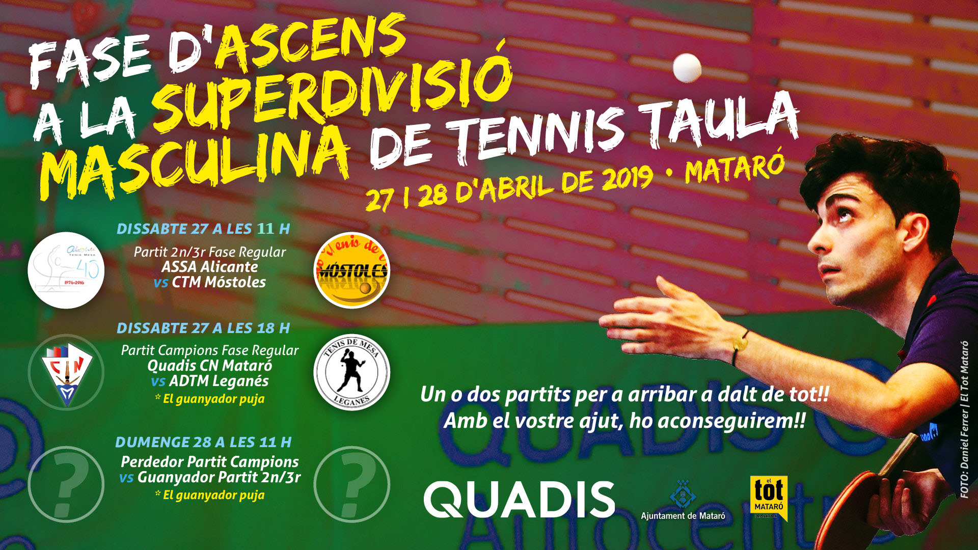 Aquest cap de setmana al pavelló, dissabte en sessió de matí i tarda i diumenge en sessió de matí, el Centre organitza la Fase d’Ascens a la Superdivisió de Tennis Taula. L’equip de la Flora ha completat una Fase Regular molt bona amb 17 victòries, i s’ha guanyat la classificació de jugar aquesta fase. El nostres, de guanyar un partit, jugarien amb els millors equips estatals la propera temporada. Tan la Flora com en Xavier Peral destaquen l’enorme igualtat que hi ha entre els quatre equips que la juguen. El Quadis-CNM surt amb l’avantatge de jugar a casa i de tenir el recolzament d’un públic que animarà molt per a assolir la fita que ja es va aconseguir ara fa quatre anys. Els altres equips, tenen jugadors de rànking i seran molt perillosos.