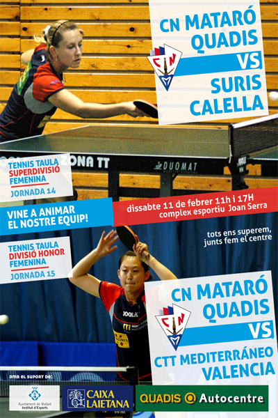 En el doble compromís que tenien les nostres jugadores del Quadis el dissabte, en el primer d’ells va saltar la sorpresa quan el Suris de Calella es va imposar a les de la Flora en un partit per xalar de valent i on ambdós equips varen jugar tennis taula d’alta escola. L’avantage incial de (2-0) del Quadis semblava que ho posava molt bé contra un equip molt difícil de jugar-hi, però el Suris s’hi va tornar, guanyant el tercer individual i imposant-se en el dobles establien la igualada a dos punts. Les visitants, tornaven a guanyar el següent matx i agafaven avantatge davant la sopresa general (2-3). La Liu Chang, en un partidàs guanyava a la seva jugadora sèrbia la Gabriela Feher i col·locava un empat a tres punts que feia pujar l’adrenalina al pavelló sencer. En el darrer matx la Natalya no va poder fer res contra la Jessica Hernández que es va imposar per (1-3) donant la victòria i els punts a l’equip calelllenc.