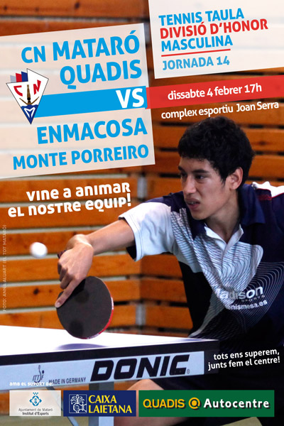 El Quadis de tennis taula masculí va embalat i no hi ha equip que li pugui discutir, ara per ara, la seva superioritat. La barreja de veterania i joventut de qualitat està donant uns resultats espectaculars i el partit contra l’Enmacosa-Monte Porreiro no ha estat una excepció. Llevat d’un empat al segon partit (l’únic punts aconseguit pels visitants) la superioritat del Quadis ha estat absoluta, com ho demostren els resultats de (3-0) amb els que els nostres jugadors s’han imposat en els darrers quatre partits. L’equip líder incontestable de la Divisió d’Honor.