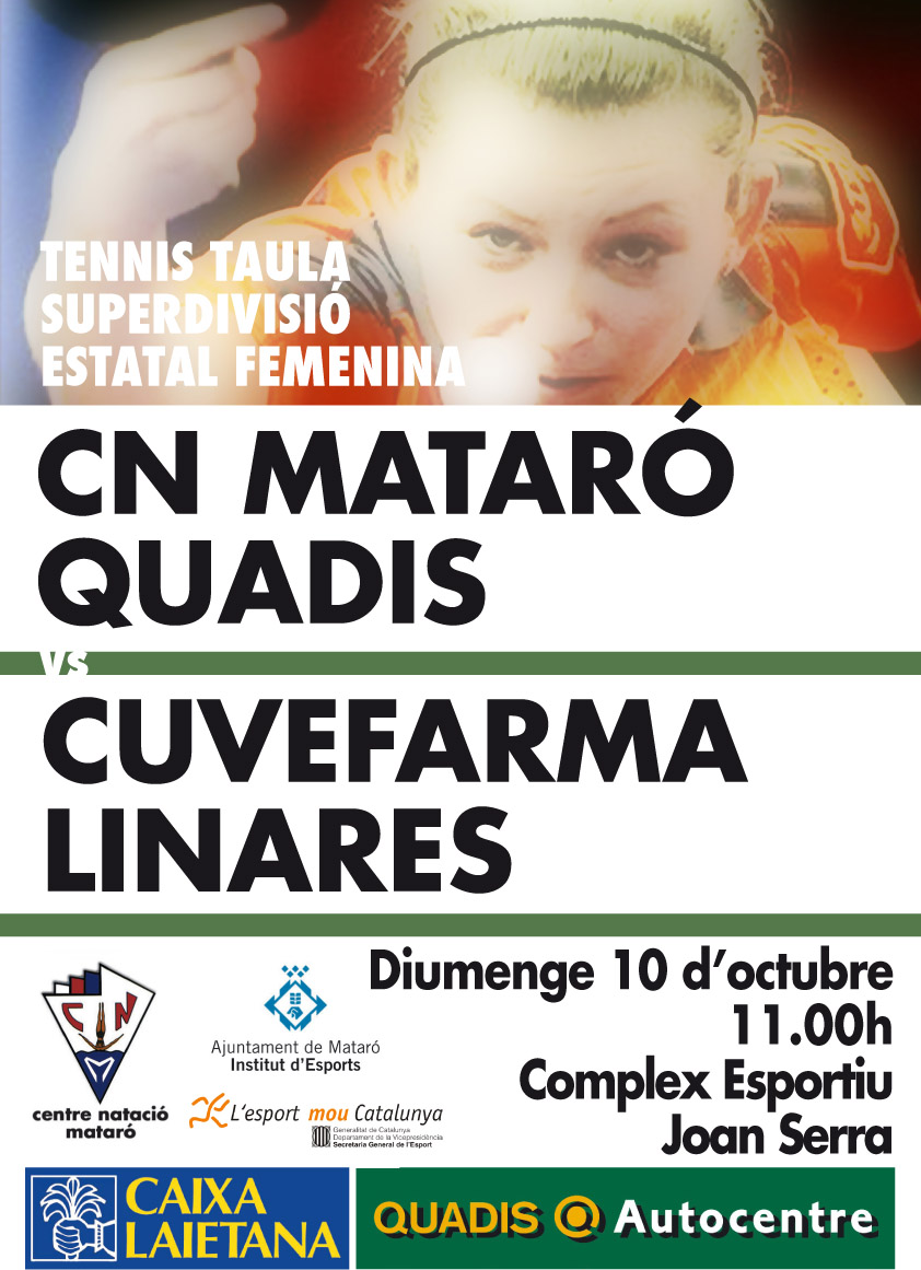 Diumenge a les 11 del matí al pavelló del Centre, el CN MATARÓ QUADIS de tennis taula jugava el segon partit de la Superdivisió Femenina contra el CUVEFARMA LINARES. Les de la Flora, líders en la primera jornada, buscaven sumar dos punts més i continuar fermes al capdavant de la classificació. I prou que ho van aconseguir amb una victòria clara i convincent davant un equip que el dia anterior havia posat contra les cordes el SURIS CALELLA caient finalment per 4-3. En l’enfrontament de diumenge, el QUADIS no va tenir excessius problemes per imposar-se pera quest resultat de 4-2, que podia haver estat encara més clar (4-1), si Liu Chang no hagués acabat caient per 2-3 i 9-11 al darrer set davant la xinesa del LINARES, Yanna Deng.