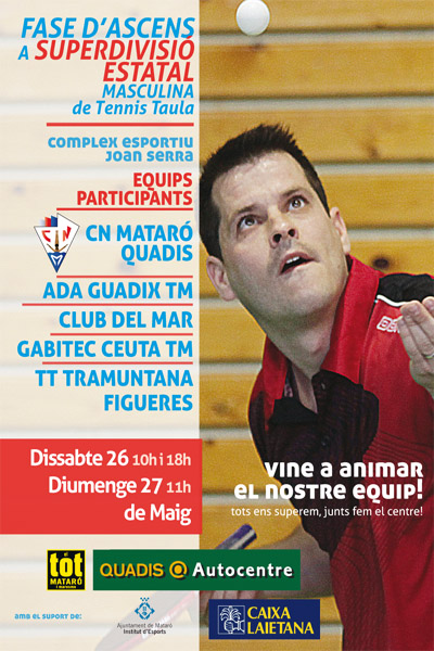 Aquest cap de setmana els nostres jugadors de tennis taula tenen una fita històrica com seria aconseguir l’ascens a la Superdivisió Masculina de tennis taula. La fase es jugarà en tres jornades, dissabte dues i diumenge al matí. El Quadis després d’una temporada espectacular on s’ha proclamat campió de la Divisió d’Honor, buscarà rubricar-ho amb la classificació per a poder jugar amb els millors la temporada que ve. Els nostres palistes conscients de la importància de l’envit estan molt concentrat i convençuts d’assolir la fita. Des d’aquí fem una crida al públic del Centre perquè vingui a recolzar els nostre equip en aquest moment tan important.