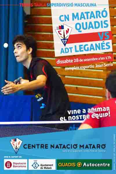 Jugaven els dos equips de tennis taula del Mataró-Quadis al pavelló. L’equip masculí rebia el l’Adt Leganés a qui ha vençut per un clar (4-0) demostrant una diferència notable de nivell. Xavier Peral, Joan Moregó i Dani Torres en dues ocasions s’han desfet del seus contricants amb claredat donant dos punts al Quadis que el col·loca a la 4a posició a tan sols dos punts del líder.