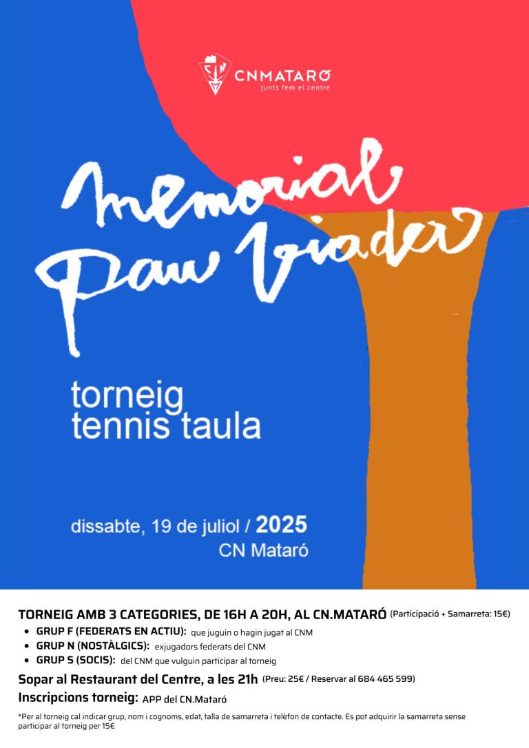 El dissabte 19 de juliol, el pavelló del Centre Natació Mataró acollirà una jornada molt especial: el Torneig Social de Tennis Taula, que tindrà lloc de 16h a 20h, i que servirà com a homenatge al nostre Pau Viader per la seva trajectòria i dedicació exemplar al club i a l’esport.