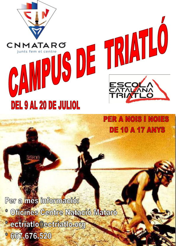 El mes de juliol, des del dia 9 fins al 20 el Centre obre el Campus de Triatló per a nois i noies d’edats compreses entre els 10 i els 17 anys. Tindreu la possibilitat de poder entrenar i formar part d’una de les seccions de més èxit del nostre club. Coneixereu tres disciplines esportives molt excitants; natació, ciclisme i atletisme i aprendreu la tècnica de totes tres per a aconseguir grans resultats. Mireu el rètol i el tríptic que us adjuntem i ja us podeu inscriure.