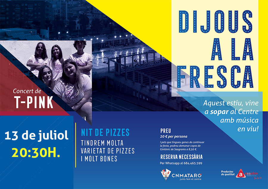 Al costat de la piscina, amb llum de posta de sol i temperatura idònia per a estar-hi molt bé, van fer que tot plegat ens cridi a venir, a continuar. Nit de Pizzes, boníssimes amb la música dels T-Pink que ho van clavar i que ens van fer companyia amb molt bones cançons de “revival” que ens va fer encara molt més agradable l’estona tinguda.