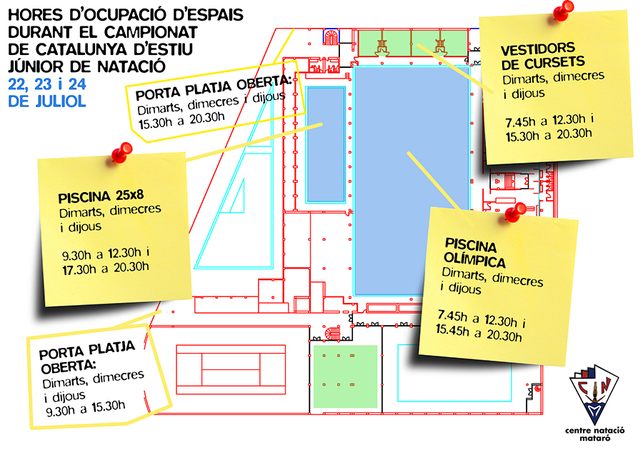 En motiu de la celebració del campionat de Catalunya d’Estiu Júnior els propers dies 22, 23 i 24 de juliol, diversos espais del Centre es veuran afectats en els seus usos horaris tal i com queda reflectit en el document.