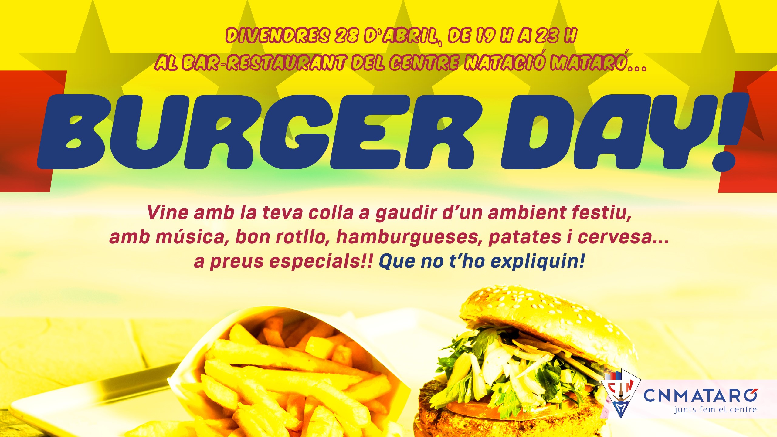 Apunta’t la data, el 28 d’abril t’esperem al “Burger Day“! A partir de les 19:00 h i fins les 23:00 h, podreu gaudir al Bar-Restaurant de la Piscina Olímpica d’hamburgueses, patates, nuggets i begudes a un preu especial. Tot, evidentment, en un ambient festiu i de bon rotllo acompanyat de bona música.