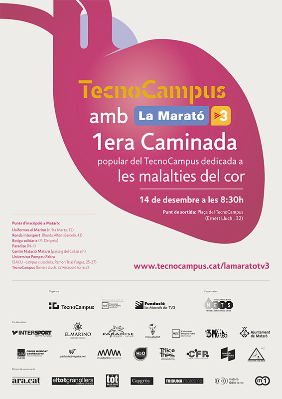 Per primera vegada, el TecnoCampus se suma a aquesta iniciativa, amb la col·laboració de l’associació d’estudiants, i organitza una caminada solidària que tindrà lloc el 14 de desembre a 2/4 de 9 del matí, amb punts de sortida i arribada a la plaça del TecnoCampus. Al final de la caminada es farà un esmorzar amb la participació dels músics “Bome Blue” i “Els aviadors”.