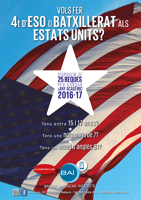 Us informem que a BAI disposem d’avantatges per als socis del Centre Natació Mataró i per a les seves famílies. Ens plau informar-vos que oferim 3 beques per cursar l’any acadèmic 2016-2017 als Estats Units! És una molt bona oportunitat per als vostres fills o familiars d’entre 15 i 17 anys que vulguin cursar l’any acadèmic 2016-2017 als EEUU. Les beques estan a disposició de qualsevol familiar dels socis del Centre Natació Mataró que compleixi amb els requisits exposats a sota.