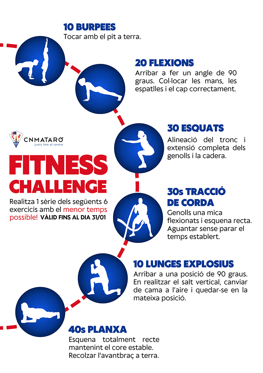 Aquest desafiament és la teva oportunitat per mesurar el teu progrés, gaudir de la competència amistosa i treballar en la teva forma física! Tens el que cal per ser un dels nostres campions del “Fitness Challenge”? Vine i demostra-ho!
