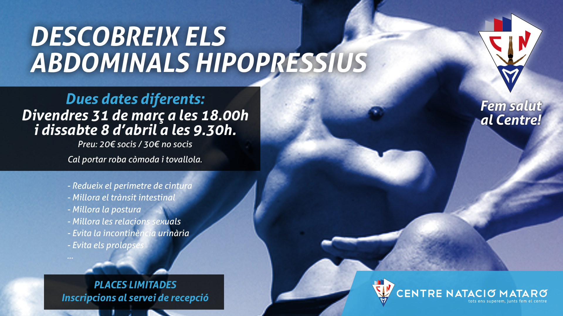 Els dies 31 de març i 8 d’abril al Centre farem un taller d’Abdominals Hipopressius. Una activitat que ens fa millorar en diversos aspectes molt importants de la nostra rutina diària. Les places són limitades, reserveu-la ja al servei d’informació