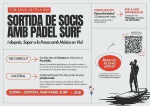 Apunta’t a la sortida de socis amb pàdel surf el pròxim 11 de juliol! Coincidint amb el darrer sopar a la fresca de la temporada, aquesta activitat començarà a les 17 hores i compta amb un nombre limitat de places, amb un màxim de 25 persones.