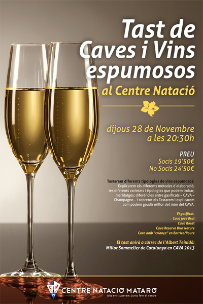 El dia 28 d’aquest mes, a les 20:30, el Centre organitza un Tast de Cava al Restaurant de La Piscina. S’explicaran diversos mètodes d’elaboració de les diverses varietats i tipologies que es poden trobar; maridatges, diferències entre gasificats; Cava, Champagne... i sobtetot els tastarem i us explicarem com poder gaudir millor de l’apassionant món del cava.