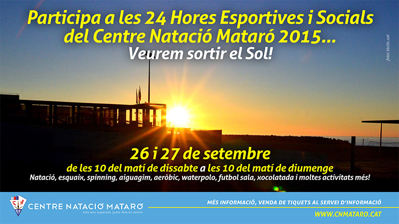 Ja les tenim aquí. El darrer cap de setmana de setembre, el 26 i 27, tindrem a la piscina una nova edició de la “nostra festa esportiva i social; les 24 hores”. Tots hi estem convidats, tots!!; esportistes de totes les seccions, socis de totes les edats, tothom hi és benvingut. Com cada any la part de la natació, buscarà superar el rècord de l’any anterior establert en 104.200 metres (uf!), però també tindrem waterpolo, tennis taula, spinning, aiguagym, botifarrada i xocolatada, inflables i un munt de coses amb les que hi passarem una estona entranyable, fent colla, fent club.
