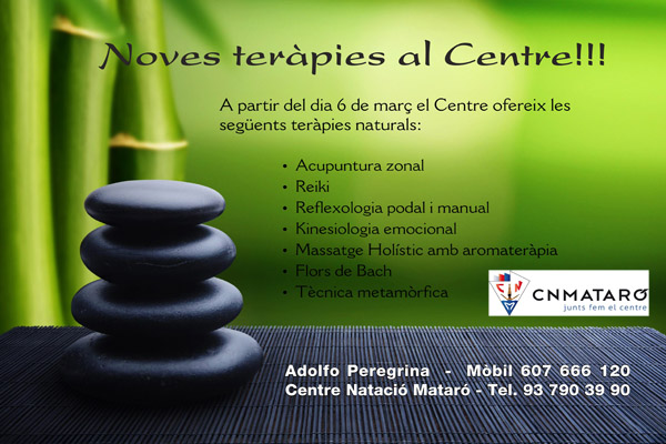 Des d’aquesta setmana el Centre ha ampliat els serveis que oferim als nostres socis. Al de fisioteràpia que tenim amb en César Gutiérrez s’amplia ara amb l’Ariadna Rivas també fisioterapeuta i que podrà abastar a molta més gent que ho sol·liciti. També dins de l’ampliació de serveis us podem oferir Noves Teràpies Alternatives a càrrec de l’Adolfo Peregrina.