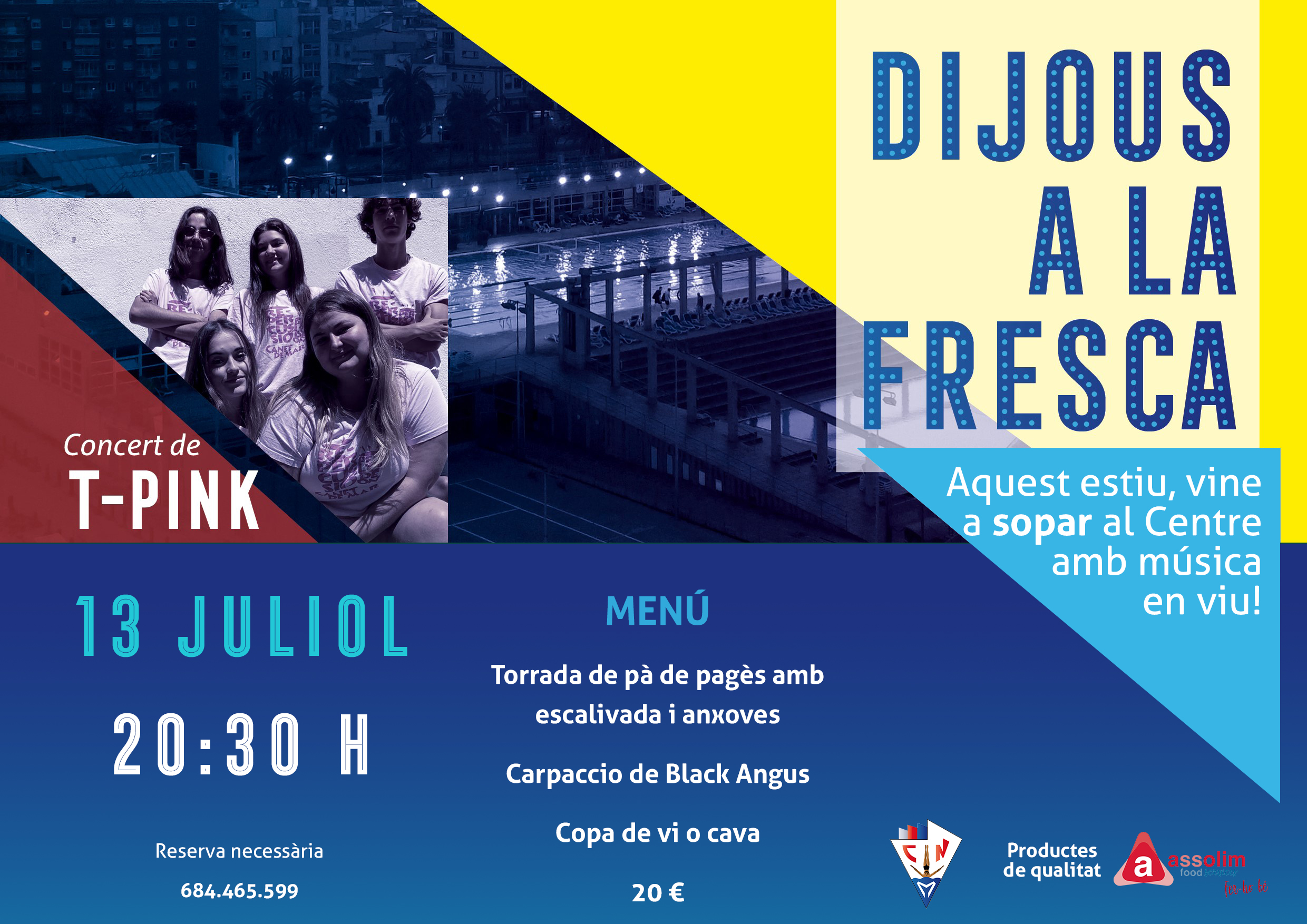 El proper dijous 13 a les 20:30 farem al centre, el darrer Sopar-Concert a la Fresca amb la música dels T-Pink que tan bé ho van fer el passat dijous.