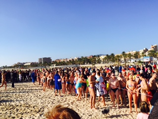 Molta, moltíssima gent la que s’ha aplegat aquest matí al Centre per a fer l’estrena del nou any tirant-se a mar a una aigua que estava a 14ºC i que ha fet tremolar a més d’un. Rialles, xiscles de fred i molt bon rotllo que s’ha estès durant tota l’estona que la gent entrava i sortia de l’aigua, alguns esperitats, d’altres hi nedaven com si estiguéssim a ple estiu. Les ones han afegit emoció a la banyada per les glopades d’aigua salada d’algun despistat. Després, ben eixugats, tots han pogut beure un bon got de xocolata calenta que ha servit per revifar. També s’han venut samarretes commemoratives per recordar aquest moment tan especial. L’acte ha estat presidit pel sr Pere Galbany Regidor d’Esports de l’ajuntament de Mataró, acompanyat del president del Centre Natació Mataró, el sr. Joan Gros.