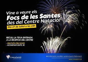 El proper 27 de juliol, amb motiu del dia dels focs de les Santes, us convidem a venir a veure l’espectacle des del Centre Natació Mataró. És una ocasió única per gaudir dels focs en primera línia, amb una vista privilegiada i en bona companyia.