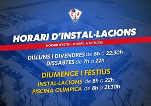 A mb el bon temps ja tenim els esperats horaris d’estiu. A partir d’aquest pròxim diumenge dia 31 de març, començarem a aplicar el nou horari d’estiu al Centre. Això significa que els diumenges i festius, les instal·lacions tancaran a les 22h, mentre que la piscina olímpica ho farà a les 21:30h. Aquest canvi ens permetrà gaudir de més temps de pràctica esportiva i activitats recreatives durant els mesos d’estiu. Estigueu atents als horaris actualitzats i prepareu-vos per aprofitar al màxim el bon temps i les nostres instal·lacions.