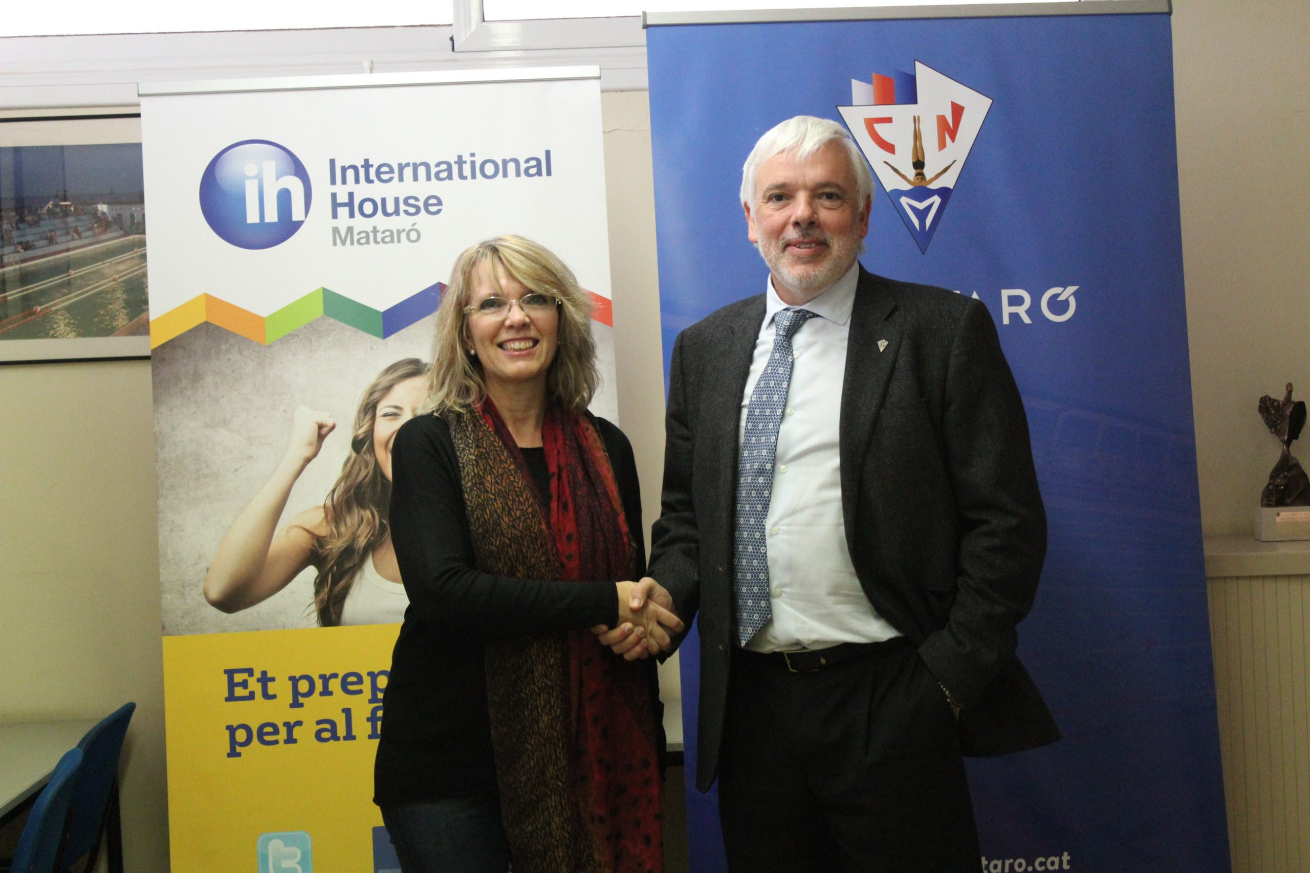 Des de fa força anys International House és un dels col·laboradors del Centre més importants i més fidels. L’acadèmia d’idiomes, una de les més importants de Mataró, ofereix descomptes en els seus cursos i flexibilitat horària perquè els nostres esportistes i associats puguin estudiar-hi idiomes amb les màximes facilitats. Des del Centre agraïm el seu compromís amb nosaltres i la seva fidelitat. El passat dilluns, al Centre, es va celebrar el protocol de firma que ens uneix un temporada més. A l’acte hi van ser presents els màxims responsables, el president del Centre Natació Mataró, el sr. Joan Gros i la directora d’Intrenational Mataró, la sra. Julie Byrne