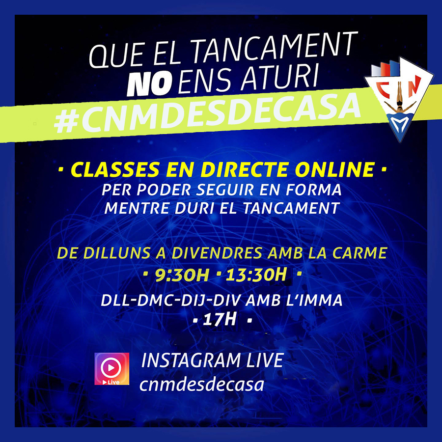 Mentre durin les restriccions de poder fer activitats en espais tancats, el Centre et dona l’oportunitat de seguir-nos i continuar la teva preparació de gym des de casa. Connecta’t a l’Insta Live a @cnmdesdecasa i posa’t FIT amb les nostres monitores, la Carme i l’Inma, en sessions de matí tarda.