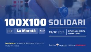 Aquest pròxim 15/12/2024 a les 11 h, el Centre Natació Mataró organitza un esdeveniment esportiu i solidari únic: un 100×100 metres solidari en suport a La Marató de 3Cat, dedicada aquest any a les malalties respiratòries.