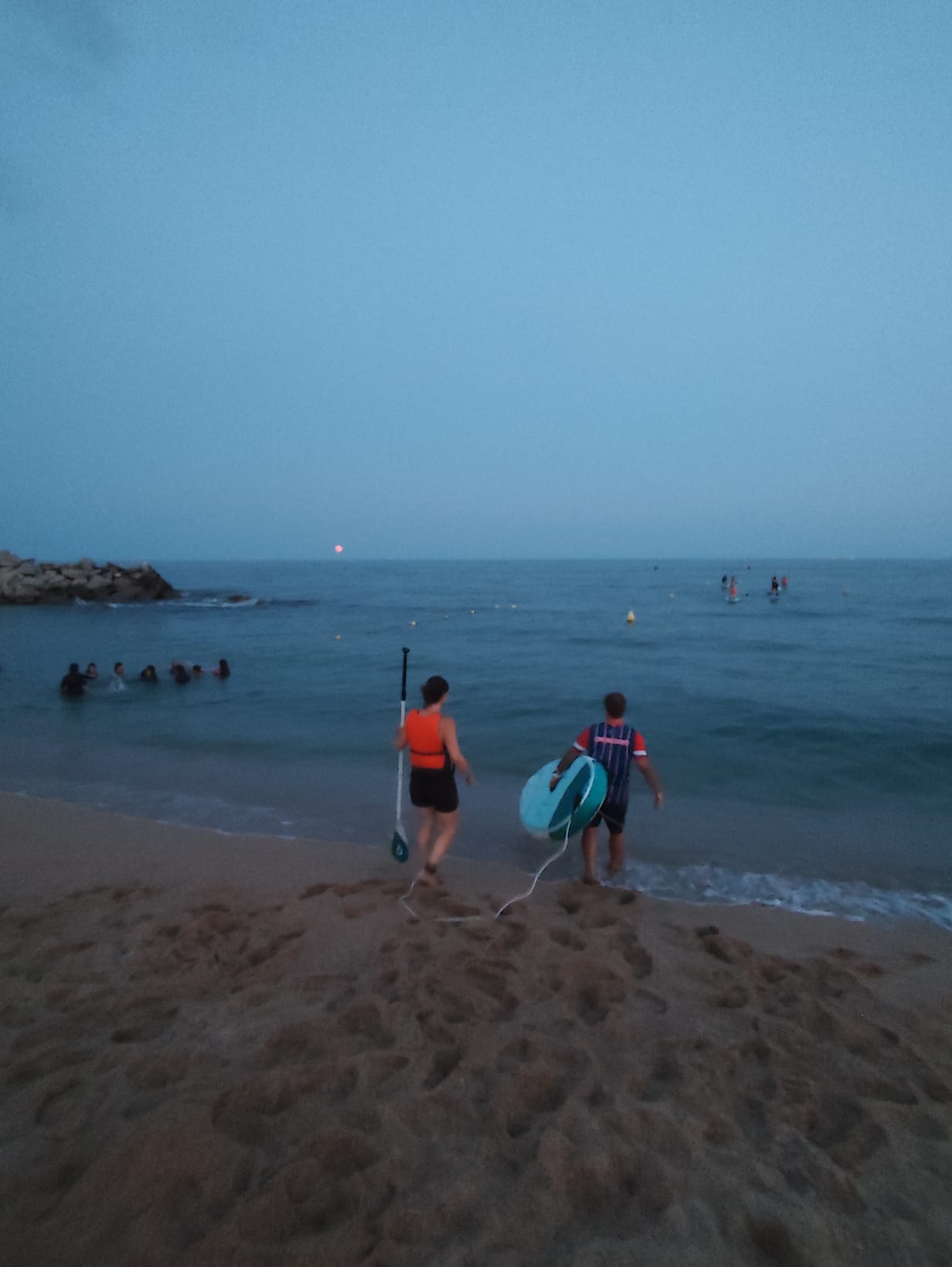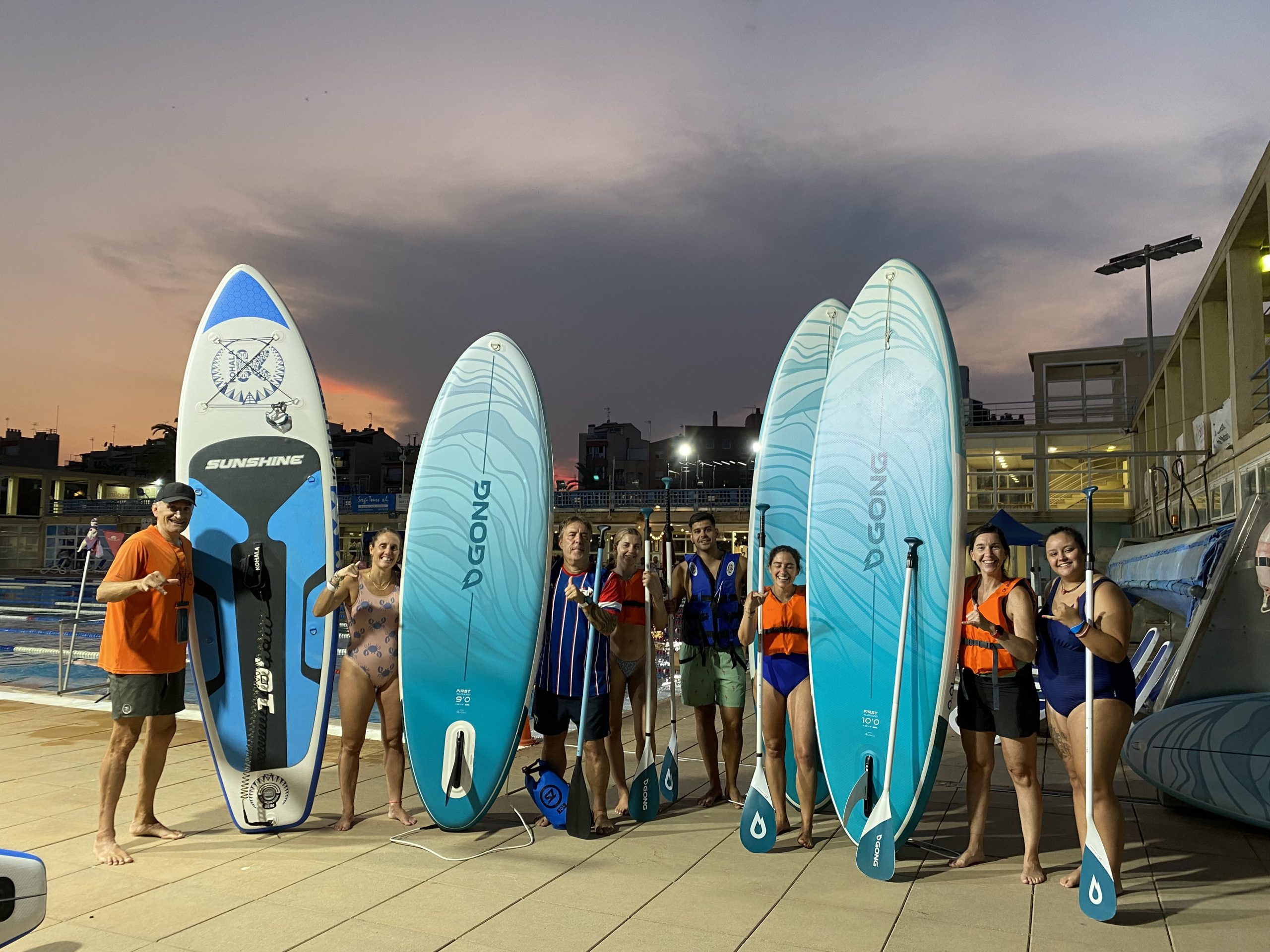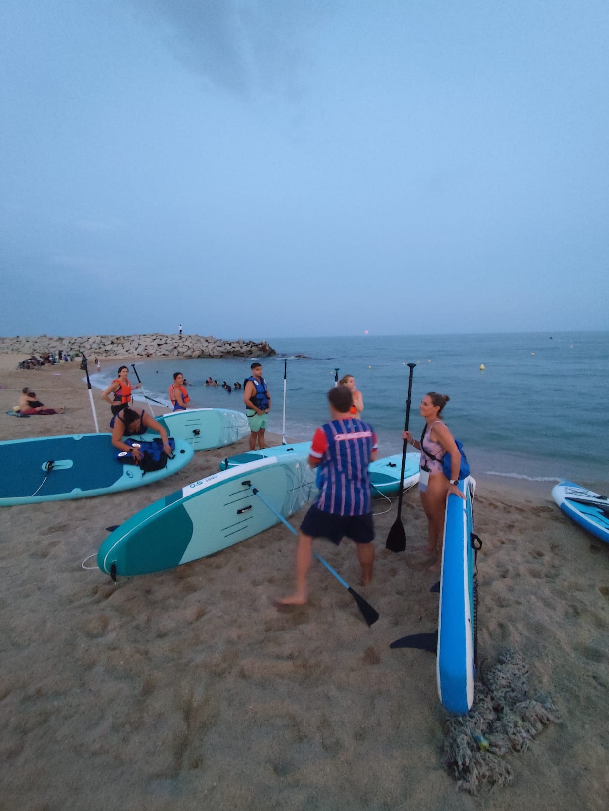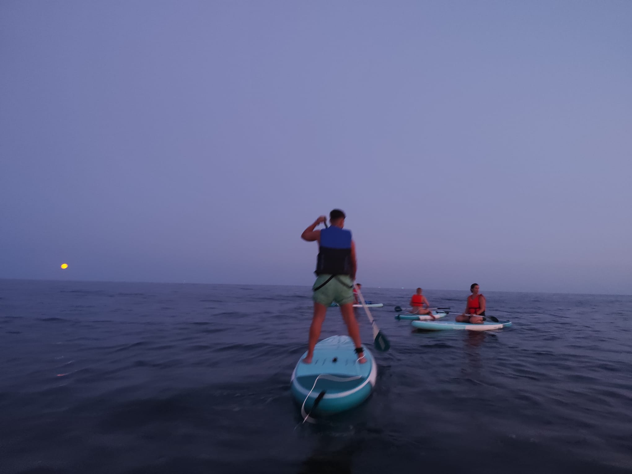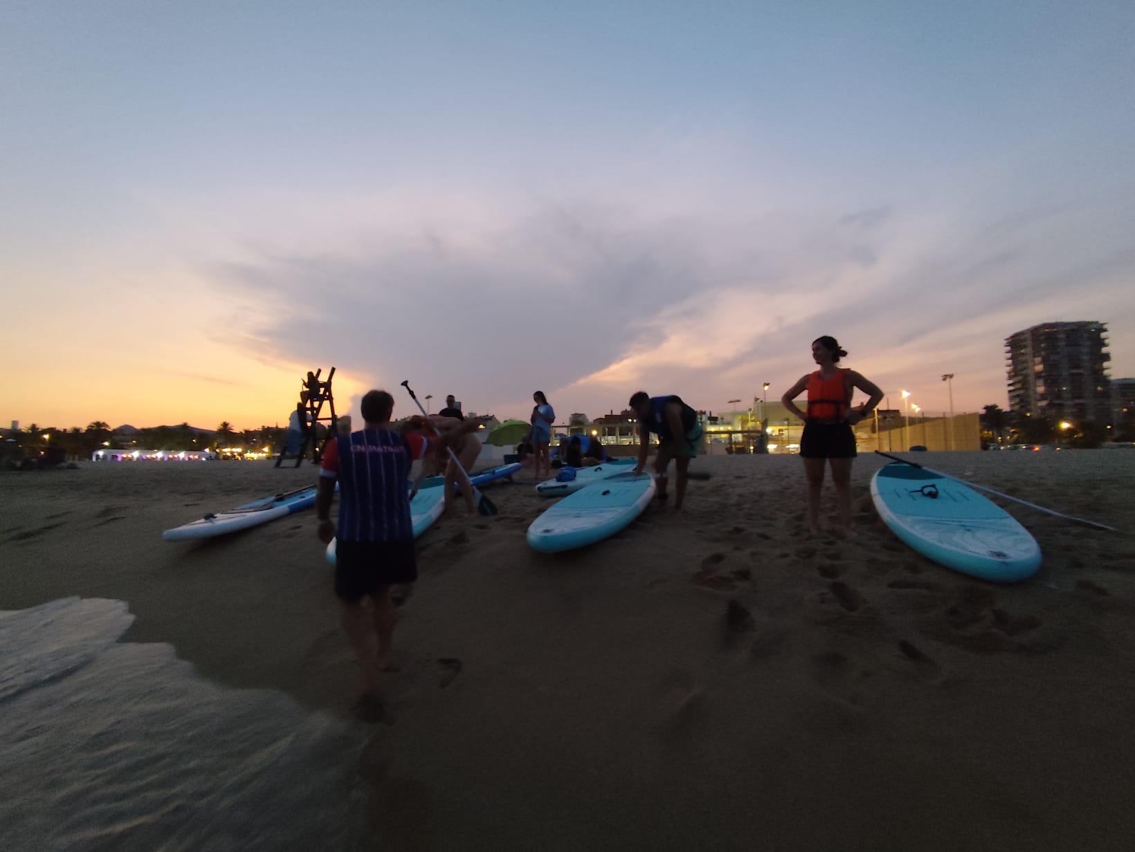 Els participants van preparar tot el material i, abans d’entrar a l’aigua, l’Òscar va oferir una sessió d’explicacions tècniques sobre com mantenir l’equilibri i remar correctament. Amb el sol ponent-se i la lluna asomant-se a l’horitzó, el grup va endinsar-se al mar per descobrir-lo d’una manera totalment diferent.