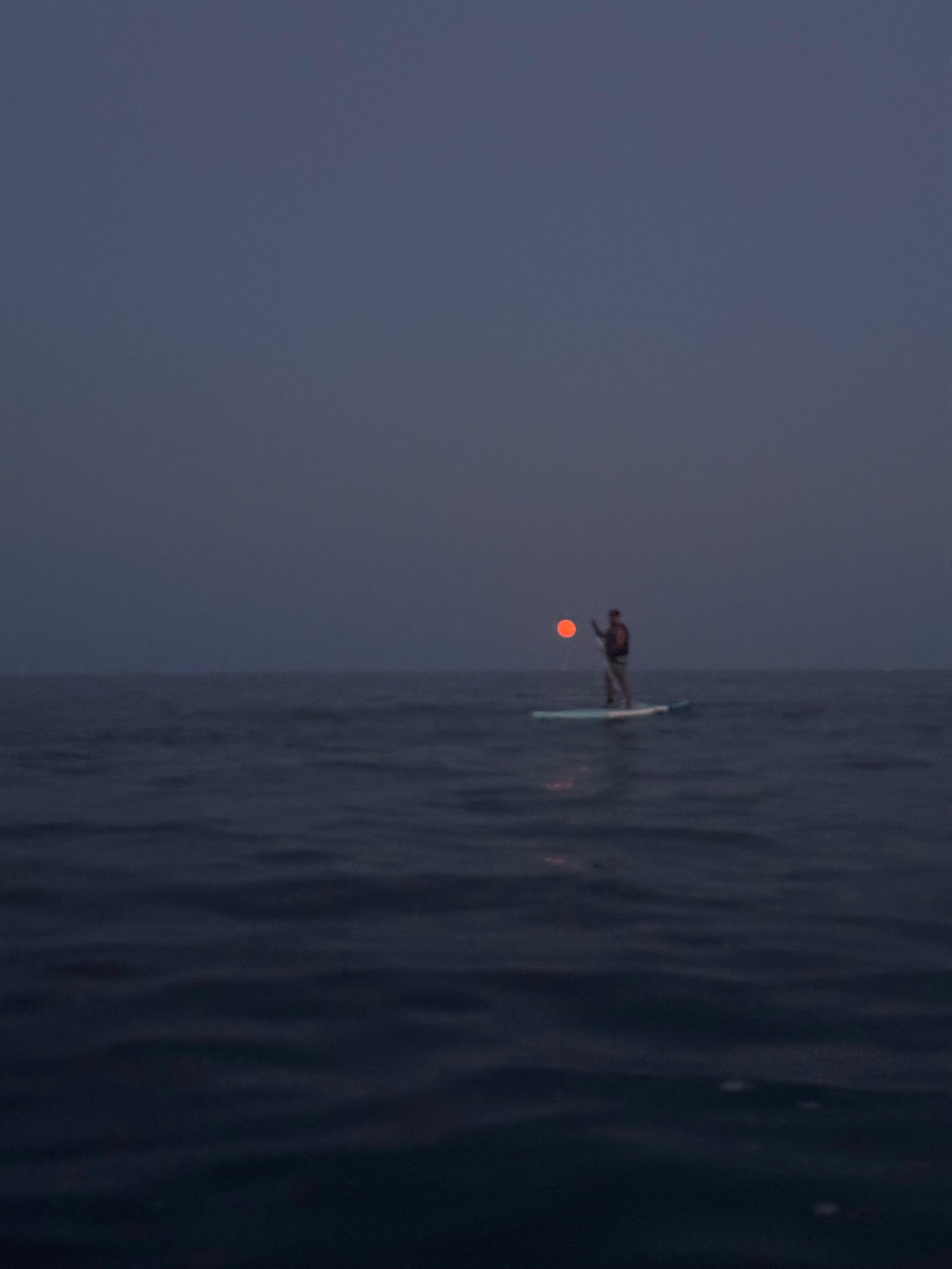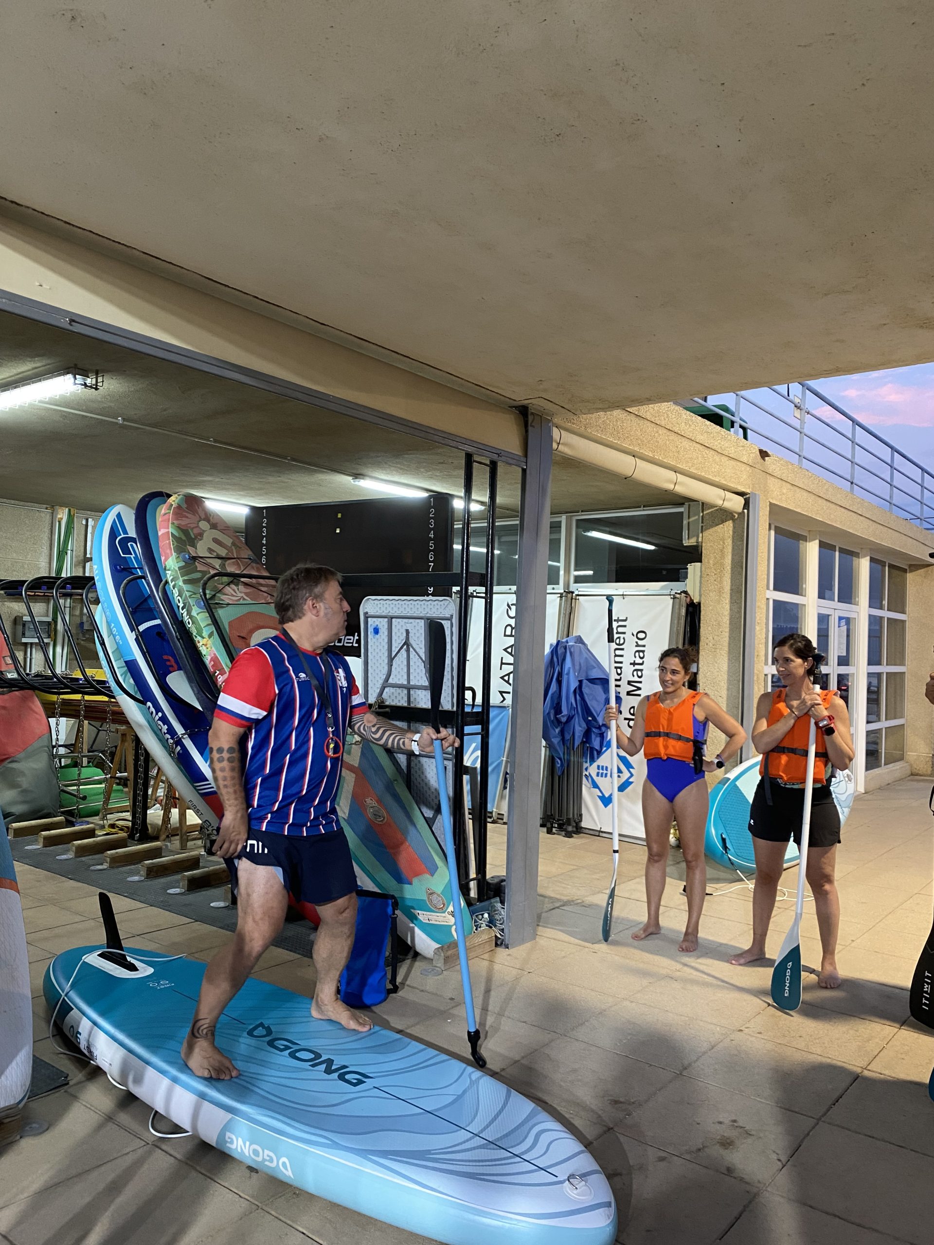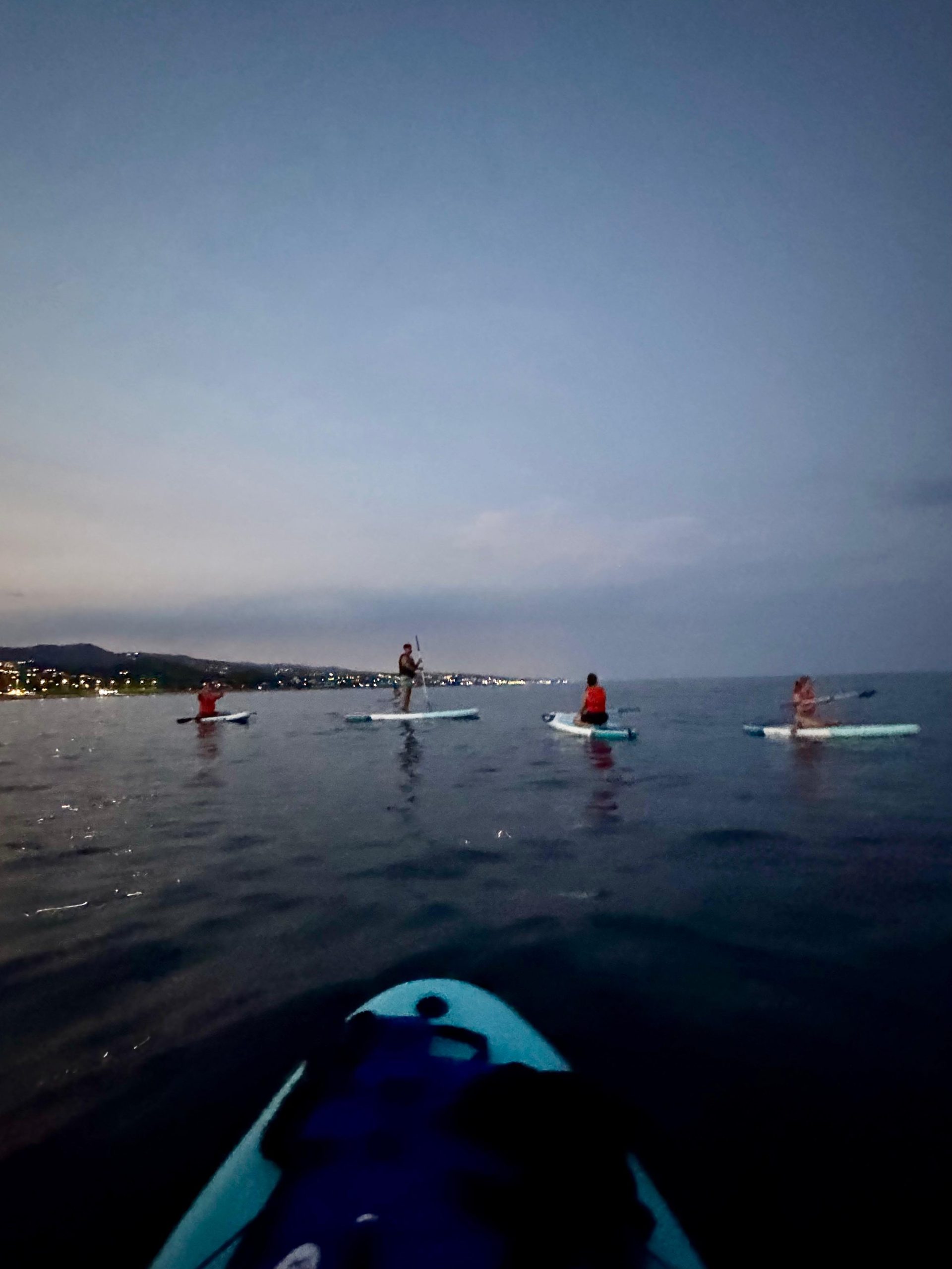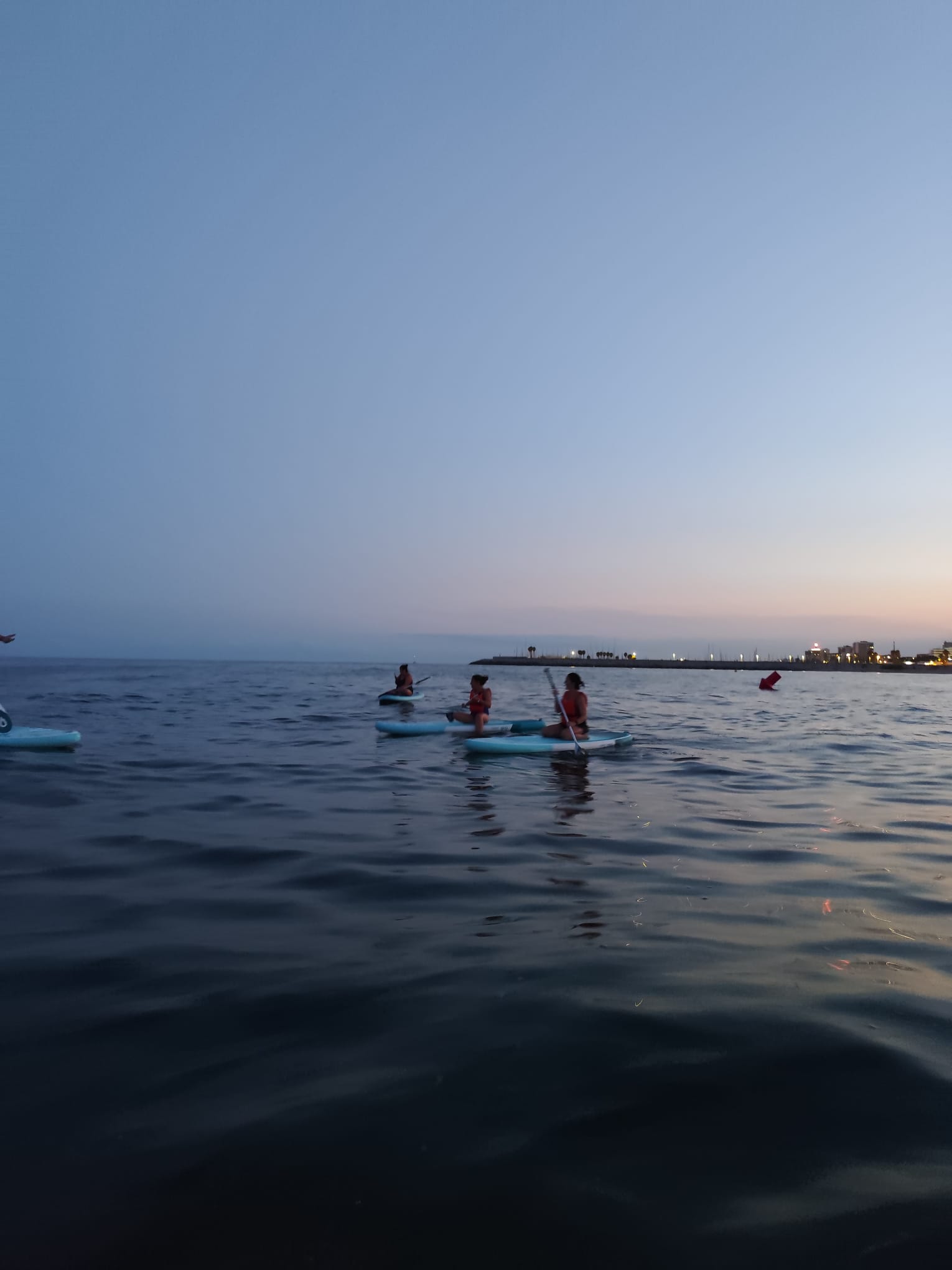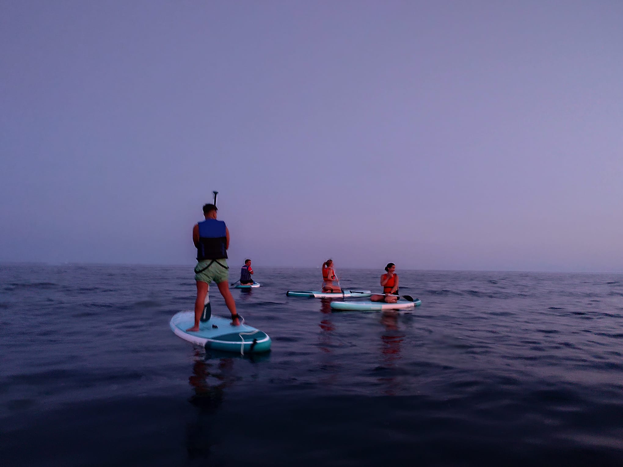 Els participants van preparar tot el material i, abans d’entrar a l’aigua, l’Òscar va oferir una sessió d’explicacions tècniques sobre com mantenir l’equilibri i remar correctament. Amb el sol ponent-se i la lluna asomant-se a l’horitzó, el grup va endinsar-se al mar per descobrir-lo d’una manera totalment diferent.