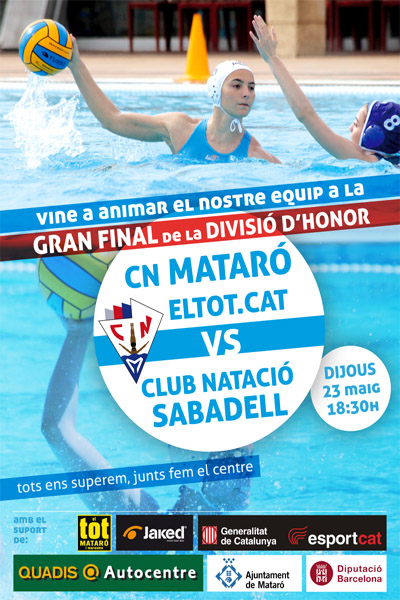 Dijous a la nostra piscina, a 2/4 de 7 de la tarda, s’inicia el play-off al títol de lliga de la Divisió d’Honor de waterpolo femení. El CN.Sabadell i el Mataró-eltot.cat han estat els millors equips durant tota la fase regular i ara s’enfronten per decidir qui serà el campió d’enguany. Les vallesanes són les clares favorites, acabades de proclamar-se campiones d’Europa, actuals campiones de lliga, de la copa de la Reina i amb un equip farcit de figures mundials, vénen a Mataró dicidides a marcar la primera diferència. Al davant, un Mataró-eltot.cat que ha experimentat una interessant progressió aquest final de temporada, on les victòries s’han vist acompanyades de molt bon joc, espera donar resposta a un Sabadell intractable.